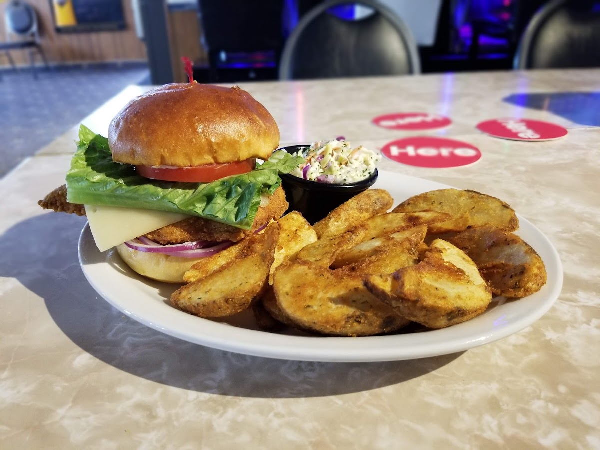 Burger and o rings typical rink burger but great tasting, rings were good also. Vintage bathrooms clean and bright, friendly staff.